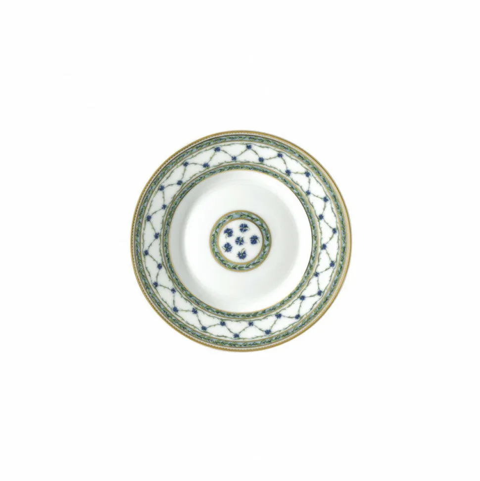 Compacte et précieuse, cette assiette plate de 22 cm conjugue élégance historique et raffinement contemporain. Parée du somptueux décor végétal de la collection Allée du Roy, elle déploie en bordure un croisillon orné de délicats barbeaux bleus et de feuillages stylisés, ponctué de lauriers et de filets d’or finement appliqués à la main. Son format est idéal pour les entrées, petites compositions ou desserts servis avec distinction.