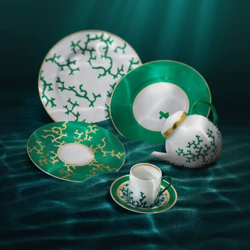Évoquant les mystères des profondeurs marines, cette assiette plate à aile de 22 cm séduit par son graphisme audacieux et la vivacité de son décor corallien, subtilement rehaussé d’un filet or.