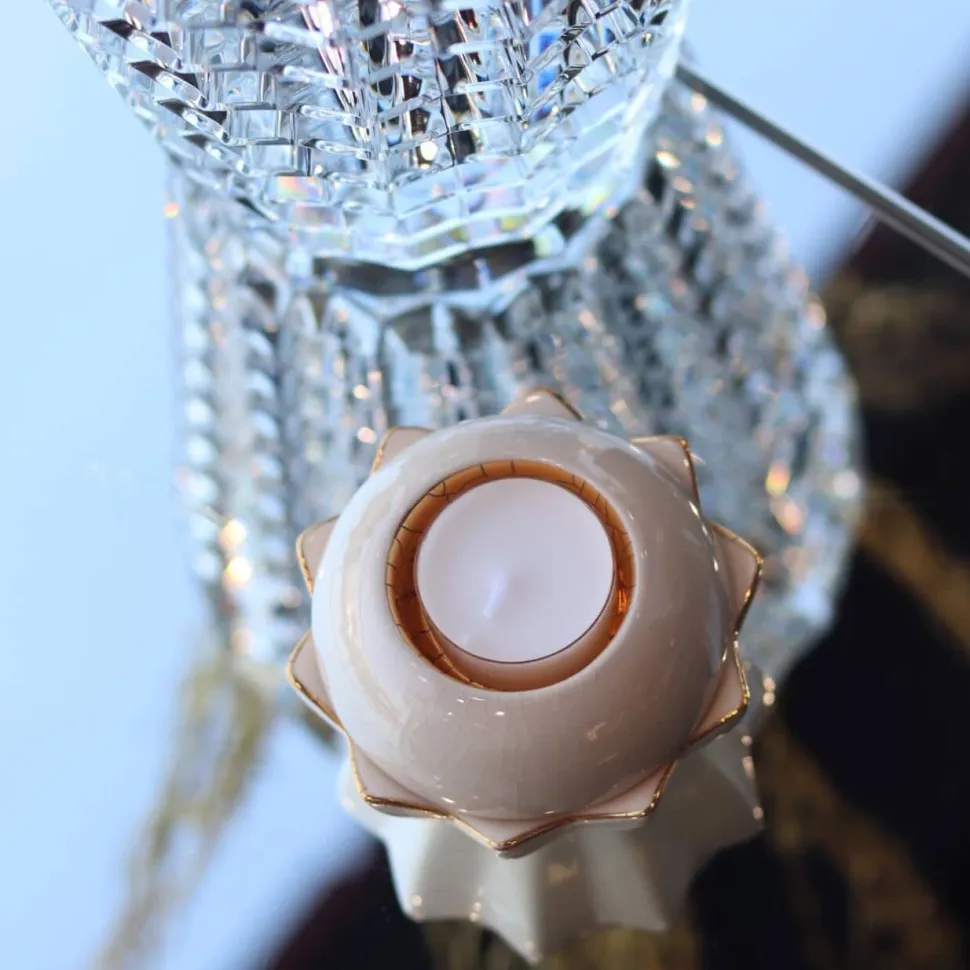 Évoquant la pureté du lotus, ce bougeoir délicat se compose d’un socle immaculé aux contours soulignés d’or, surmonté d’une coupole aux teintes douces, ivoire, vert d’eau ou rose. Chaque intérieur est sublimé d’un éclat d’or 24 carats, symbole de lumière et de renouveau. Élégance et spiritualité s’entrelacent dans cette création raffinée.