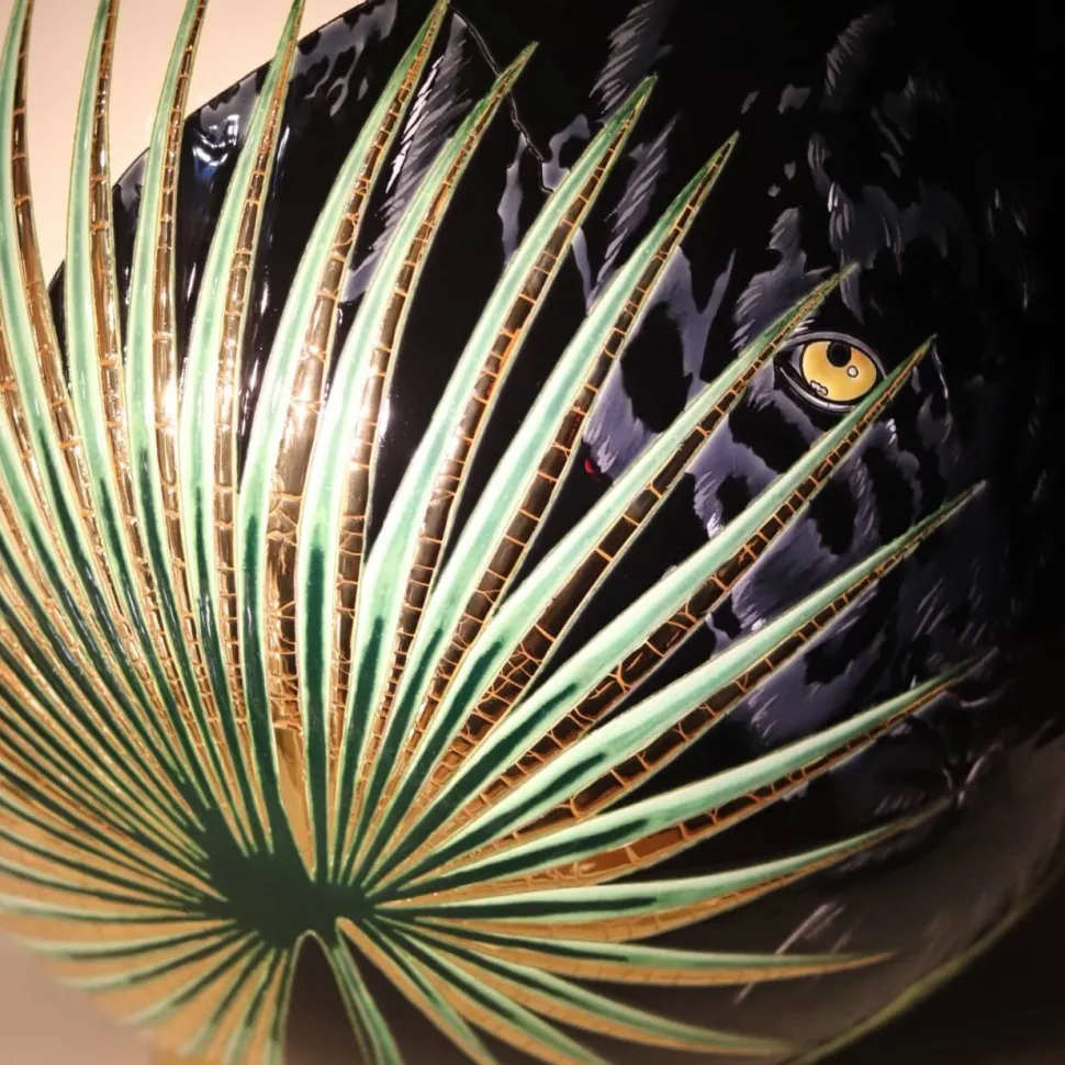 Passionné par la nature et les animaux, le designer Cédric Peltier excelle dans l’art figuratif, toutes les oeuvres de l’artiste sont pensées dans le détail. C’est ainsi que caché par quelques feuillages et oiseau de paradis, nous découvrons le regard perçant d’une panthère noir prête à bondir, ou encore à son opposé un léopard qui nous observe fixement nous permettant de plonger dans son regard d’azur.