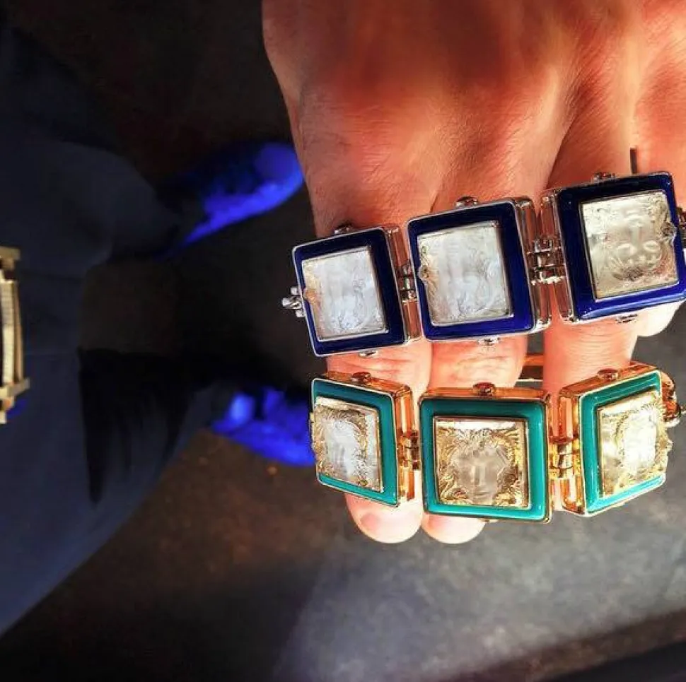 La célèbre collection Aréthuse, motif « Masque de Femme », dévoile le visage d’une femme symbolisant la nymphe Aréthuse, coiffée d’une faune aquatique. Bracelet en vermeil, motifs en cristal incolore, laque de couleur turquoise et corail. Découvrir la collection Aréthuse.