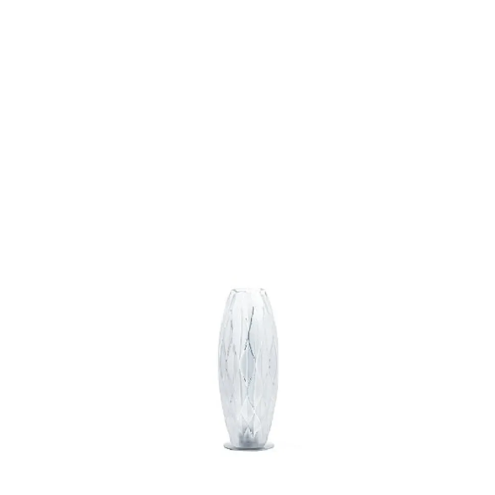 Vibration: un hommage à la matière. Dans l’Atelier, le cristal étiré, travaillé au cœur de sa matière, dessine sur la forme naissante des vagues de lumière et délivre toute la quintessence de sa pureté.