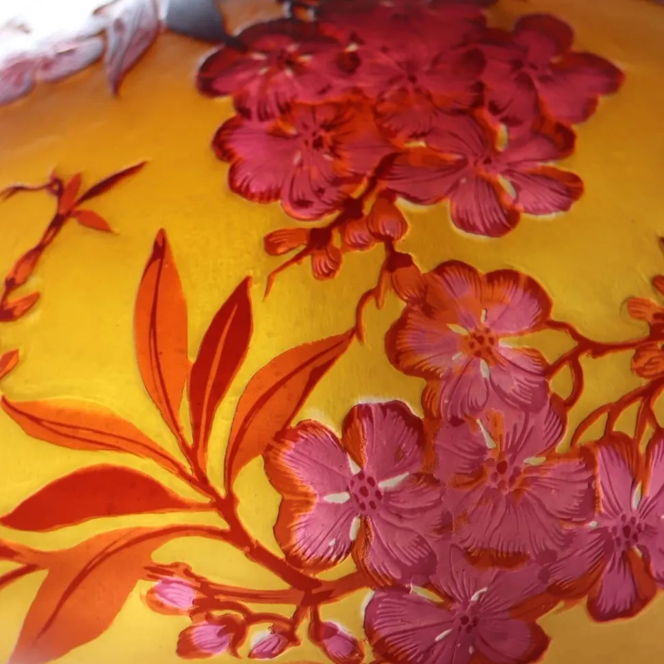 Symbole de la Période Art Nouveau, ces lampes sont des créations du même style que celles d’Emile Gallé. Le verre multicouche, travail à chaud, est une superposition par cueillage successif de couches de verre de couleurs différentes. Dans un premier temps, l’artiste fait le dessin du décor. Ce dessin devient ensuite un motif décoratif qui est appliqué sur la pièce afin de reproduire l’ornementation. À l’aide d’un vernis, l’ouvrier recouvre les parties de la pièce à protéger de l’attaque de l’acide. La pièce peut ensuite être travaillée de différentes façons, au pinceau ou plongée dans un bain.