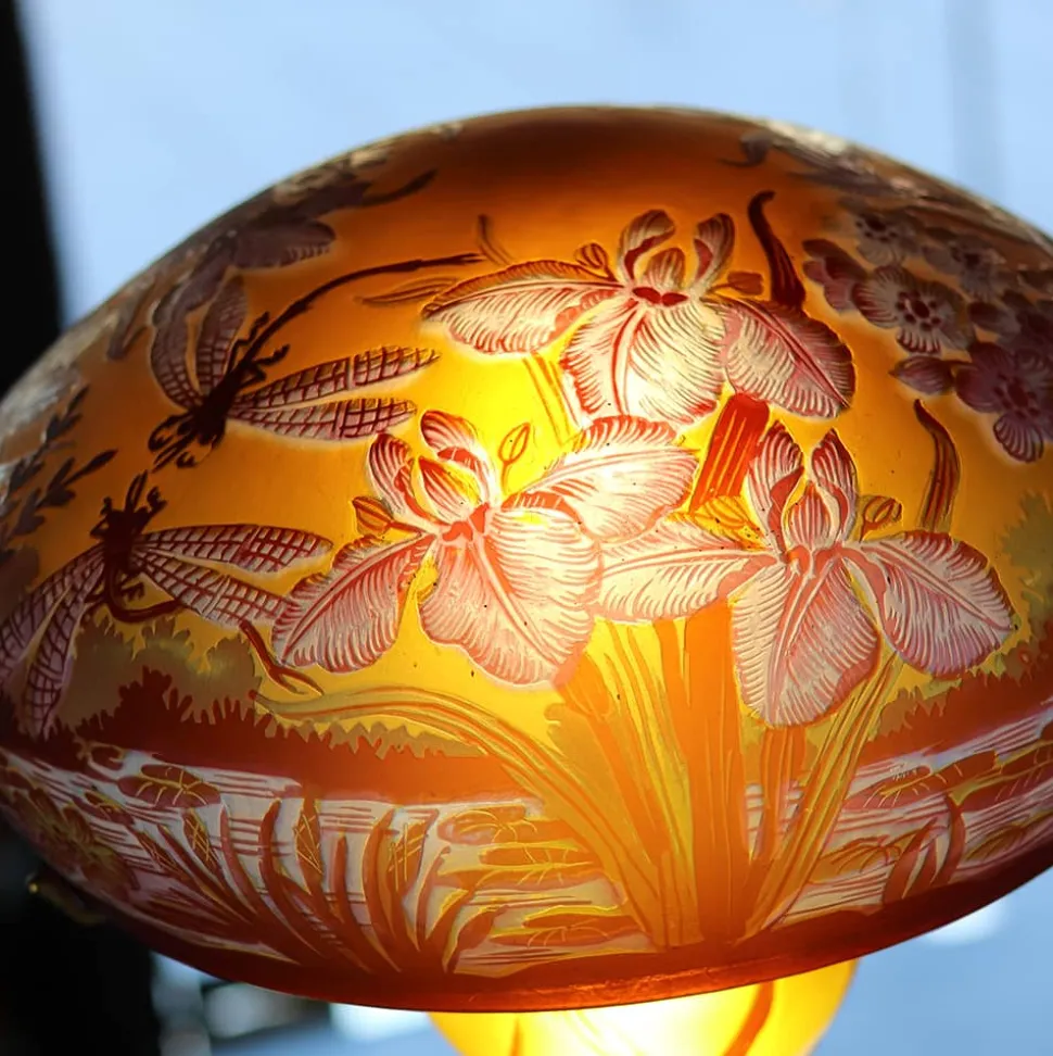 Symbole de la Période Art Nouveau, ces lampes sont des créations du même style que celles d’Emile Gallé. Le verre multicouche, travail à chaud, est une superposition par cueillage successif de couches de verre de couleurs différentes. Dans un premier temps, l’artiste fait le dessin du décor. Ce dessin devient ensuite un motif décoratif qui est appliqué sur la pièce afin de reproduire l’ornementation. À l’aide d’un vernis, l’ouvrier recouvre les parties de la pièce à protéger de l’attaque de l’acide. La pièce peut ensuite être travaillée de différentes façons, au pinceau ou plongée dans un bain.