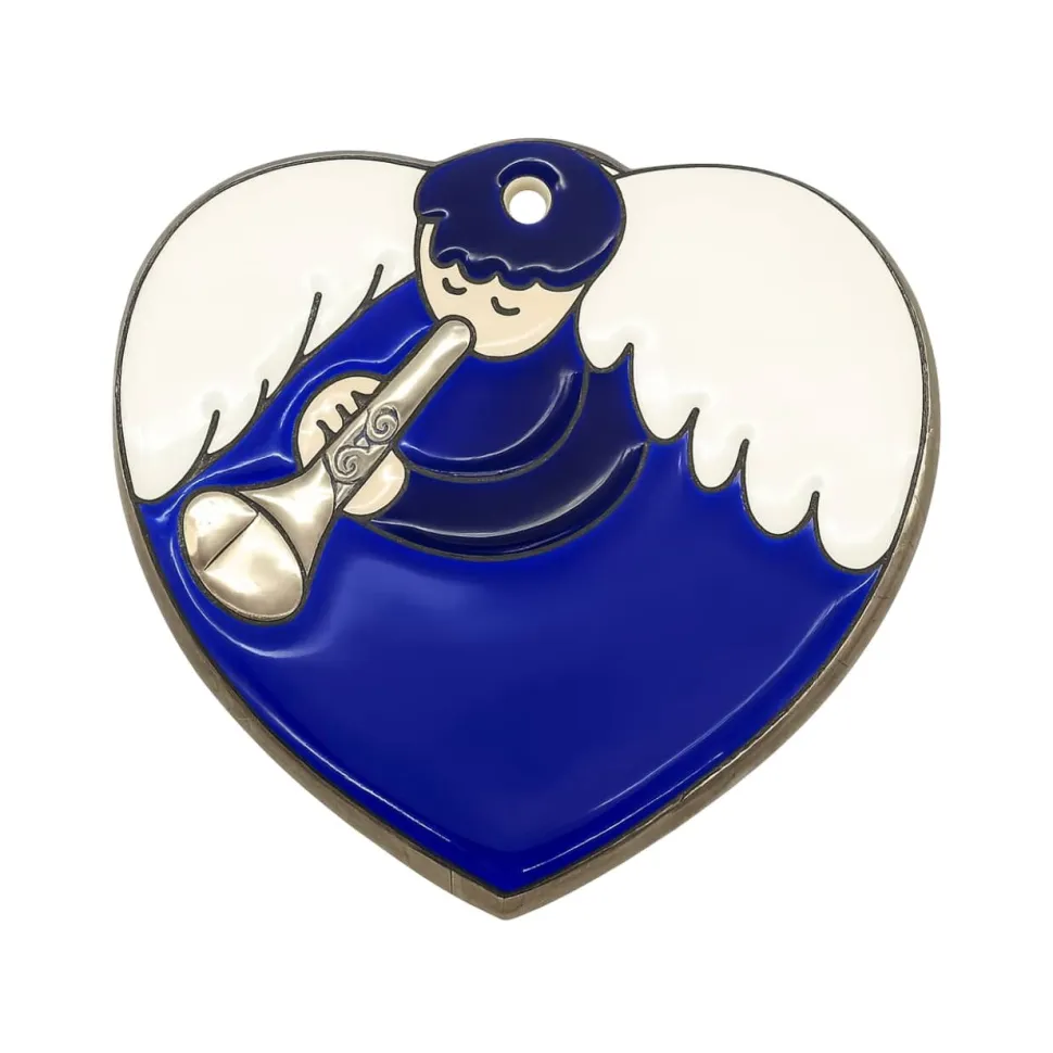 Symbole d’amour céleste, ce Cœur d’Ange imaginé par la Manufacture des Emaux de Longwy 1798 enchante par la douceur de ses lignes et la profondeur de son bleu royal. Entouré de platine, l’ange musicien y souffle une mélodie de paix. À suspendre ou poser, il illumine l’hiver de sa grâce intemporelle.