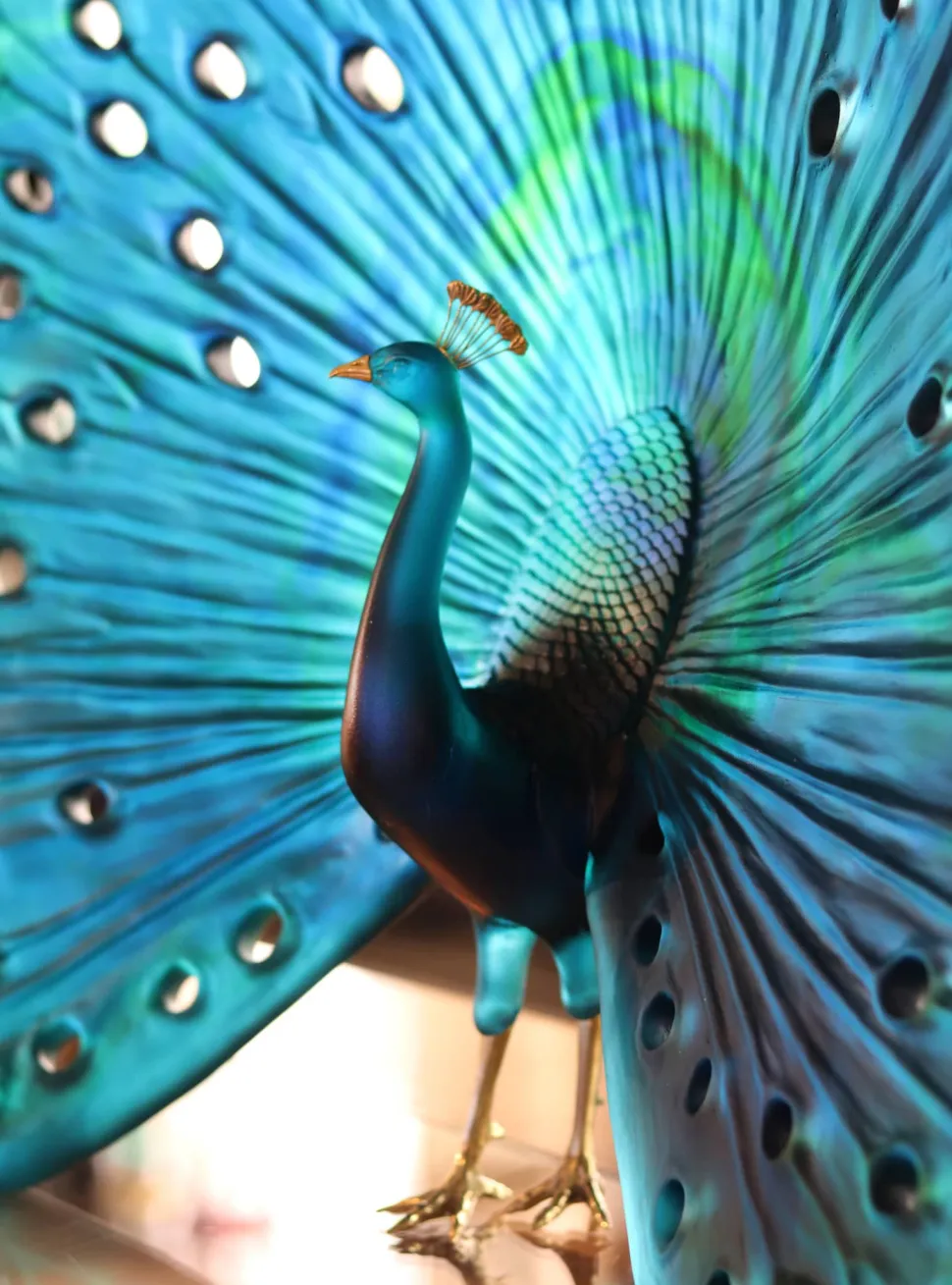 Le Paon et son plumage spectaculaire sont un thème cher à l’artiste. Avec cette nouvelle sculpture, Madeleine van der Knoop immortalise l’extraordinaire roue du Paon, un des plus beaux spectacles de la nature. Le cristal Daum révèle les couleurs sublimes des plumes du paon, le jeu de lumière met en valeur les magnifiques nuances de verts et de bleus de cette parade majestueuse. Son bec et aigrette dorés subliment les délicates particularités du paon.