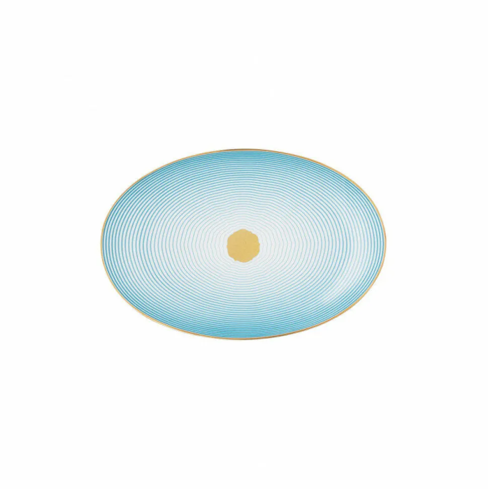 Sublimez vos tables avec le plat ovale de la collection Aura de Raynaud, une pièce majestueuse en porcelaine de Limoges. Son décor graphique aux lignes bleues intenses, rayonnant vers une pastille d’or centrale, compose un effet visuel saisissant et poétique. Idéal pour la présentation de vos poissons, viandes rôties ou préparations festives, ce plat apporte élégance et modernité à toutes vos réceptions.