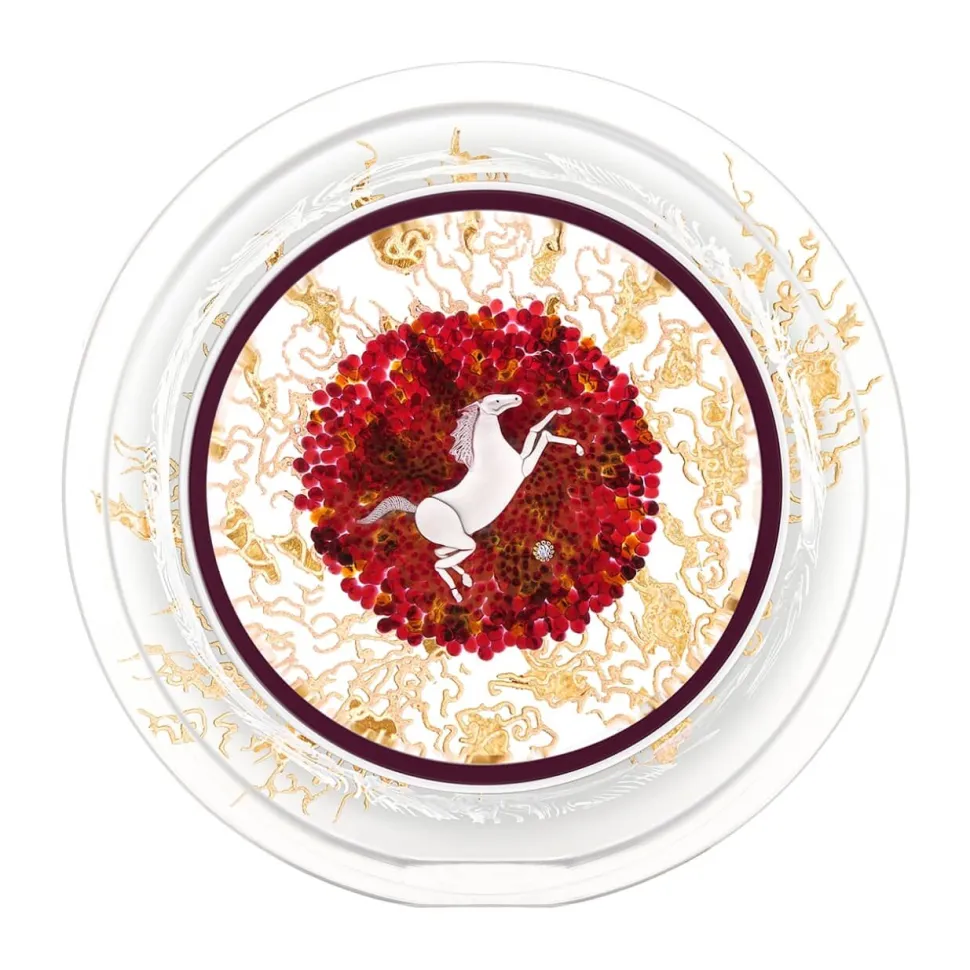 Le presse-papier est ainsi décoré d’arabesques dansantes et animées, en écho à la force et l’énergie du cheval de feu qu’il concentre en son sein. Le tout est enfin recouvert d’une couche plus épaisse de cristal clair.