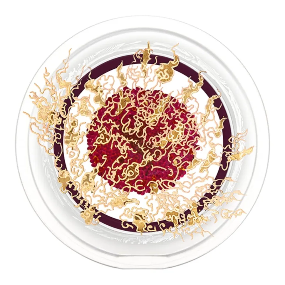 A l’arrière, le presse-papiers est décoré d’arabesques, réalisées grâce à la technique du sablage. Ces dernières évoquent des flammes pleines de vie. Ces arabesques sont peintes à la main à partir d’or 24 carats.