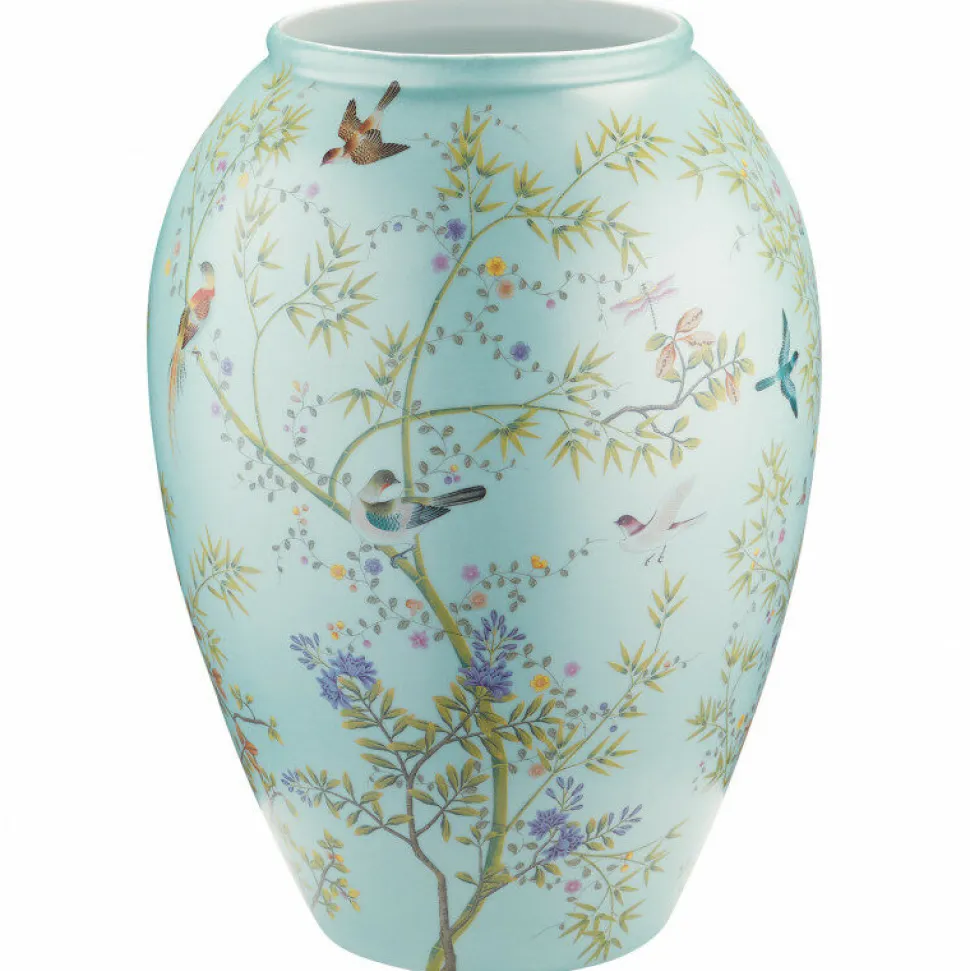 Invitez la poésie de la nature dans votre intérieur avec cette somptueuse jarre de 35 cm issue de la collection Paradis. Son décor délicat révèle un paysage onirique peuplé d’oiseaux multicolores, de branches fleuries et de feuillages dorés, sur un fond céladon doux et lumineux.