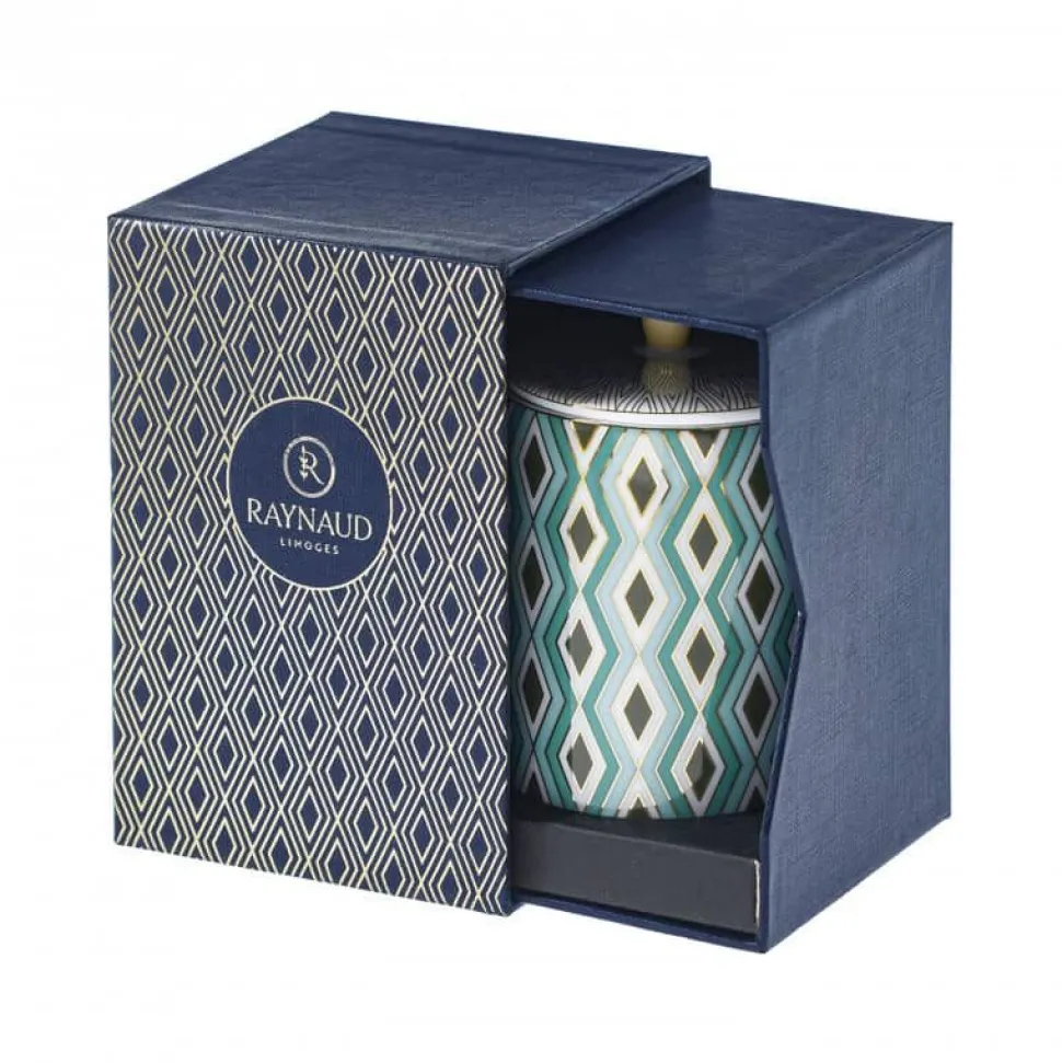 Son décor géométrique aux nuances élégantes de vert tendre et de jade, sublimé par de délicats filets d’or, évoque la richesse ornementale de l’Orient ancien. Son couvercle assorti, orné d’un bouton en porcelaine dorée, en fait un objet précieux qui, une fois la bougie consumée, se transforme en ravissante boîte à bijoux ou à secrets.