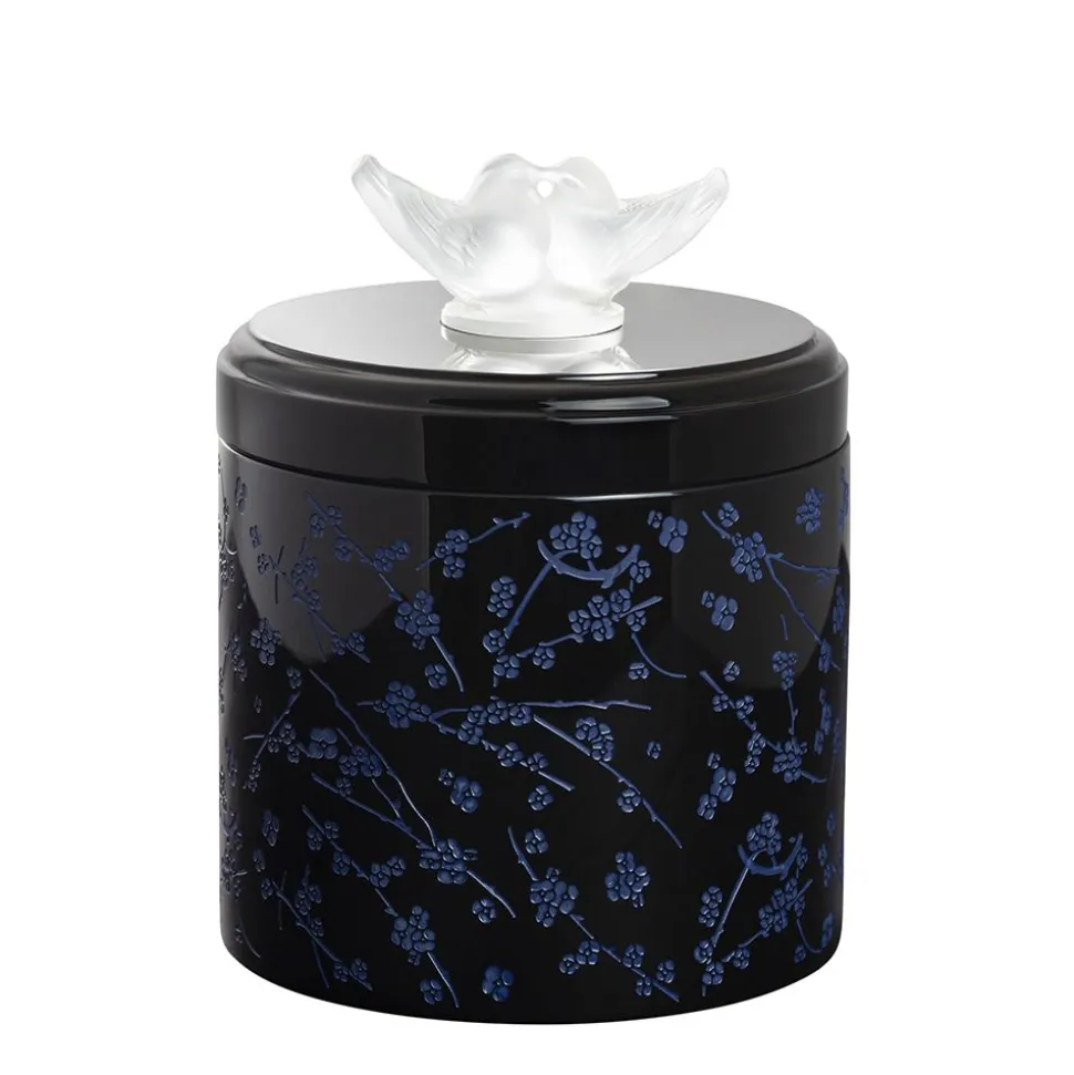 Déclinée en trois tailles, la boite en cristal présente un intérieur et un motif de fleurs de cerisier bleu nuit mat contrastant avec la brillance de la laque noir. Son couvercle se pare de la sculpture 2 Colombes, symbole d’amour et de paix. Les plateaux et cadres-photos, déclinés chacun en deux tailles, s’illuminent d’un cristal godronné.