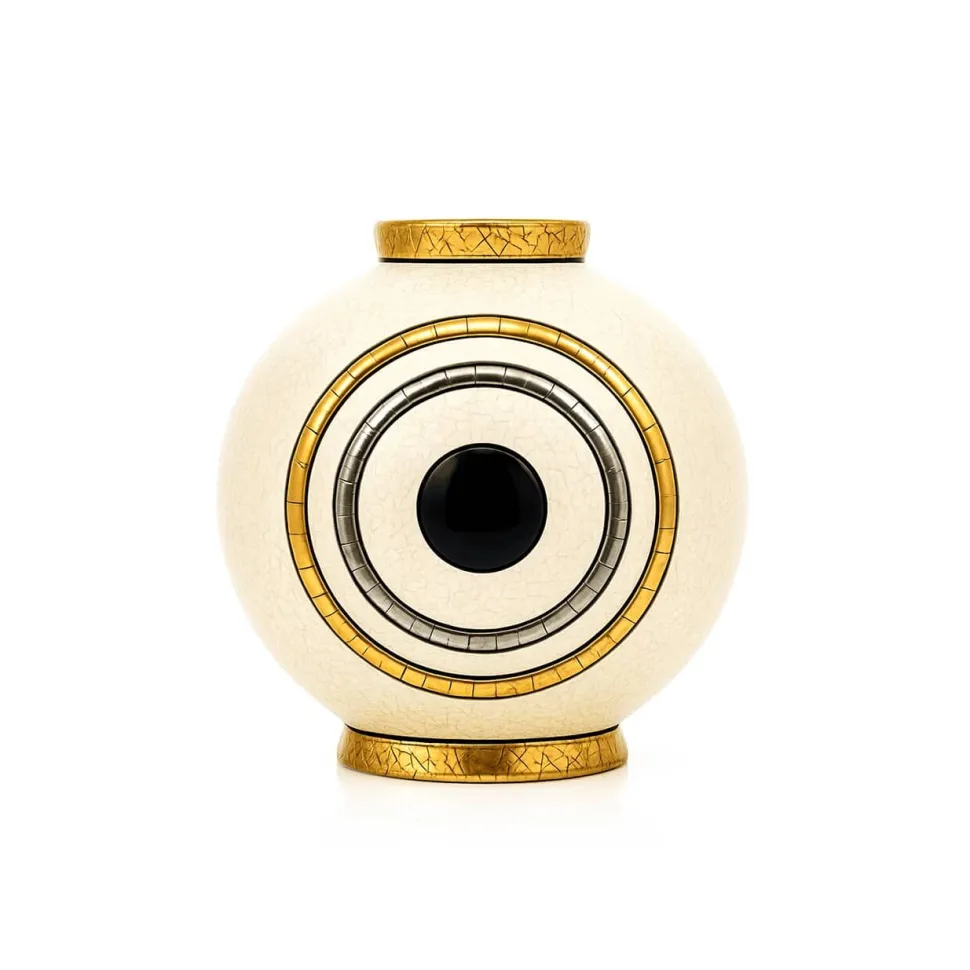 Boule fond blanc brillant non craquelé, décor noir, or 24 carats et platine 19 carats.