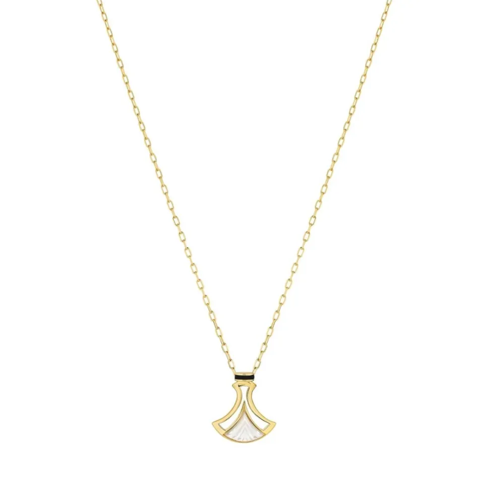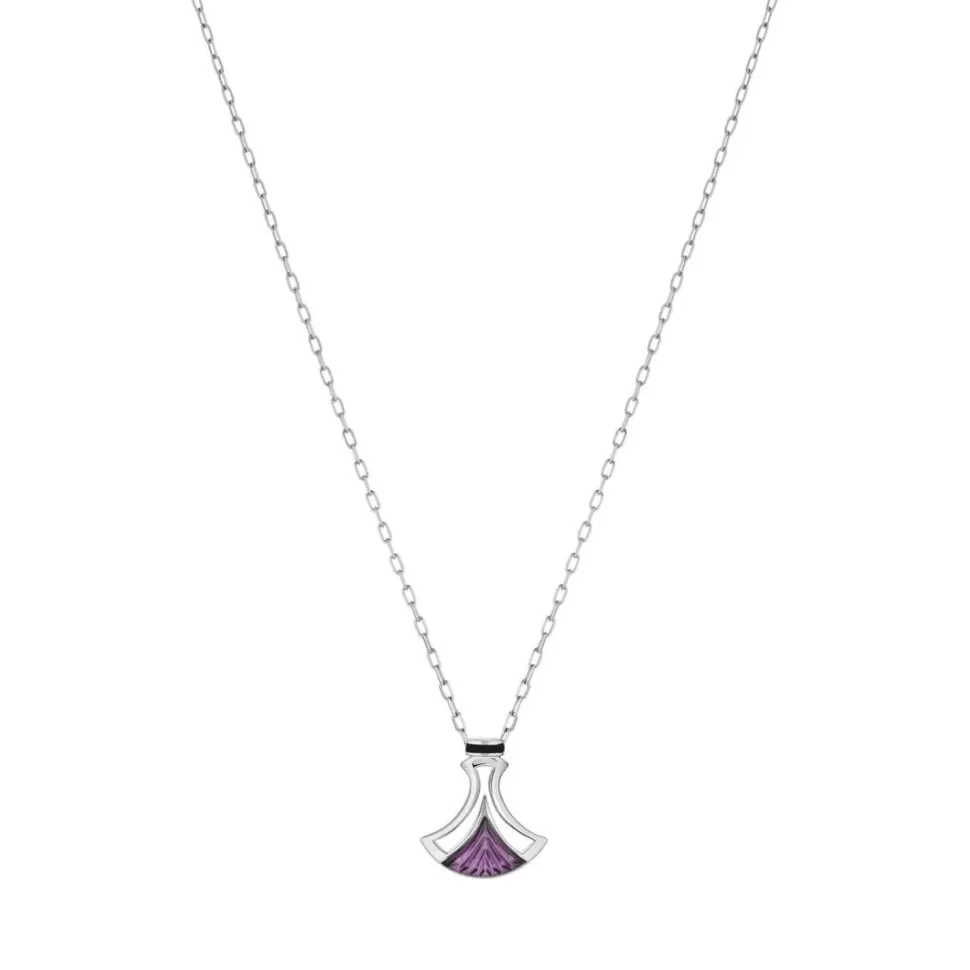 Le cristal subtilement sculpté de stries fait rayonner ce délicat collier. La silhouette géométrique de sa monture ajourée rappelle des structures architecturales en arcade mêlant métal et verre. L’intemporel cristal incolore paré d’or lumineux, ou l’argent serti d’un cristal violet crépuscule, sont soulignés d’une fine bande de laque noire dans l’inspiration Art déco.