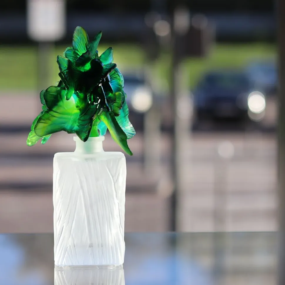 La Maison Daum présente le flacon à parfum prestige « L’envol de papillons ». Une envolée de papillons aux teintes de vert et de bleu est délicatement posée sur le dessus du flacon. Le flacon est produit par la technique du « verre soufflé ». Le bouchon exceptionnel du flacon à parfum, orné d’un kaléidoscope de papillons délicats, devient plus qu’un flacon, mais un objet décoratif. Bouchonnage à l’émeri.