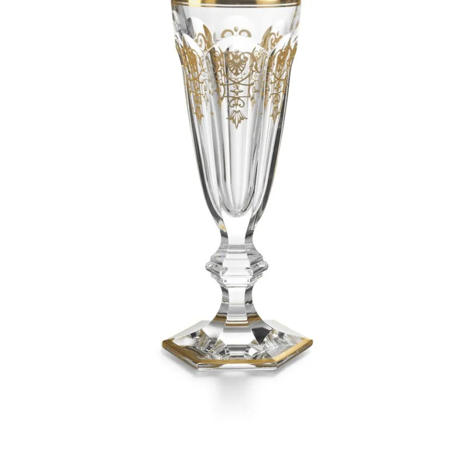 Le service Harcourt, iconique de la cristallerie Baccarat, a paradé à la table des plus grands. D’or et de cristal, la flûte Empire présente un fin liseré or autour du buvant, accompagnée d’un motif doré sur les côtes plates de la paraison. Un décor doré appliqué à la main par les artisans verriers, symbolisant prestige et royauté.