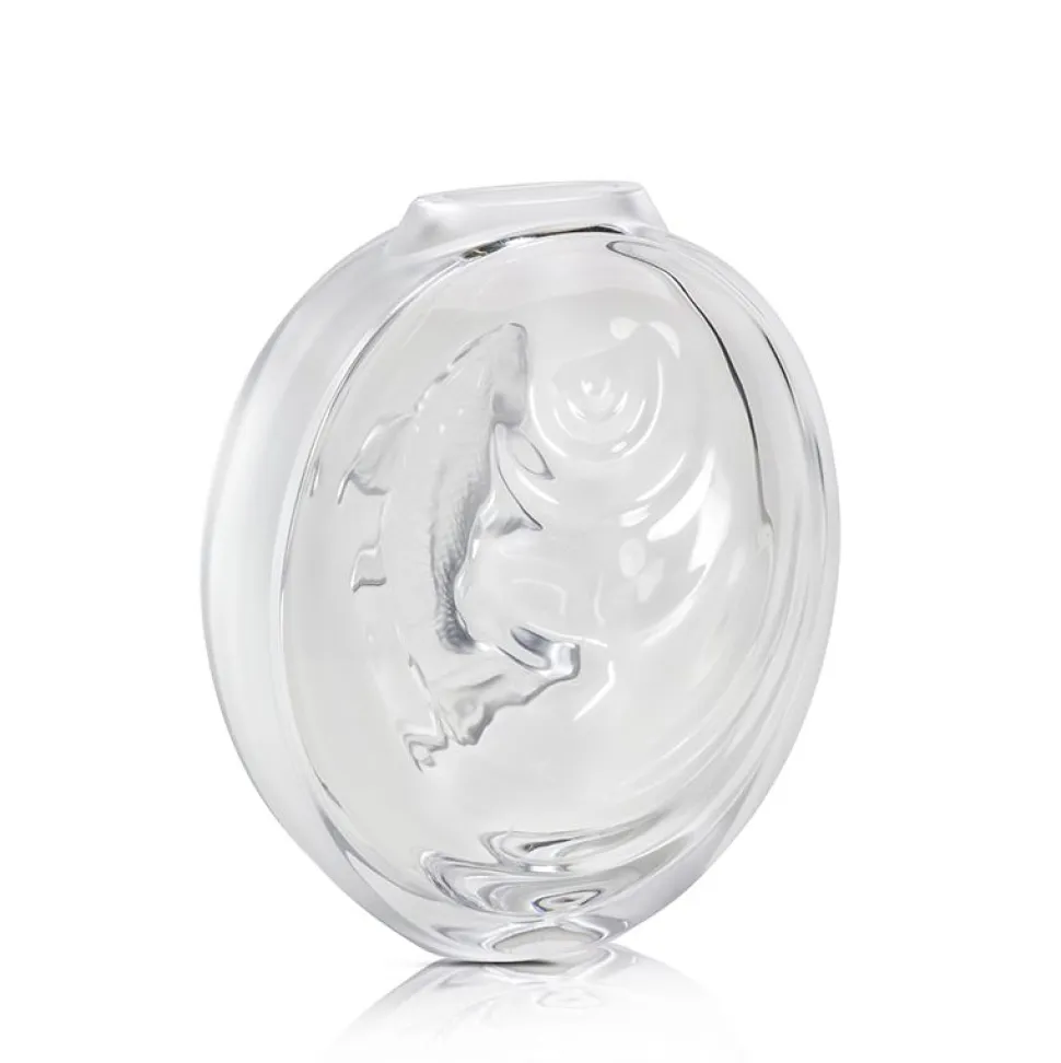 A travers le mouvement de l’onde animant la face avant du vase, une carpe Koï, sculptée en intaille sur la face arrière, semble remonter à la surface de ce lac de cristal. Répondant à la géométrie des lignes, la pureté du cristal incolore, vert menthe ou bleu Persépolis, délivre ici toute sa lumière.