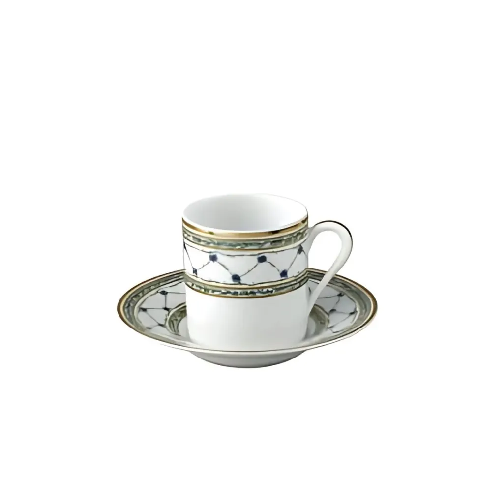Savourez l’instant avec distinction grâce à cette élégante tasse à café en porcelaine de Limoges, d’une contenance de 13 cl. Parée du somptueux décor Allée du Roy, elle déploie autour de ses parois un raffiné croisillon végétal rehaussé de barbeaux bleus et de feuillage vert, ponctué de filets dorés appliqués à la main. Sa silhouette droite, équilibrée par une anse délicate, s’accompagne d’une soucoupe coordonnée qui reprend avec justesse les éléments du décor.