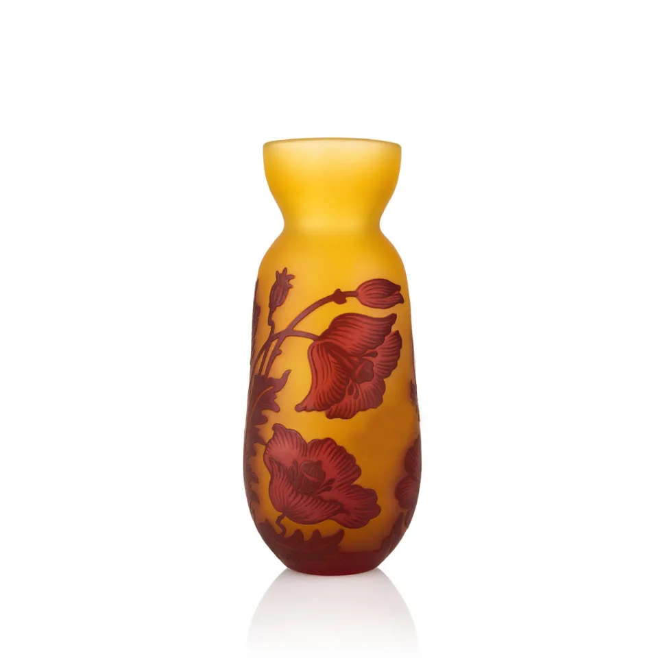 Symbole de la Période Art Nouveau, ce vase présente un verre multicouche, travaillé à chaud, avec une superposition par cueillage successif de couches de verre de couleurs différentes. Dans un premier temps, l’artiste fait le dessin du décor. Ce dessin devient ensuite un motif décoratif qui est appliqué sur la pièce afin de reproduire l’ornementation. À l’aide d’un vernis, l’ouvrier recouvre les parties de la pièce à protéger de l’attaque de l’acide. La pièce peut ensuite être travaillée de différentes façons, au pinceau ou plongée dans un bain.