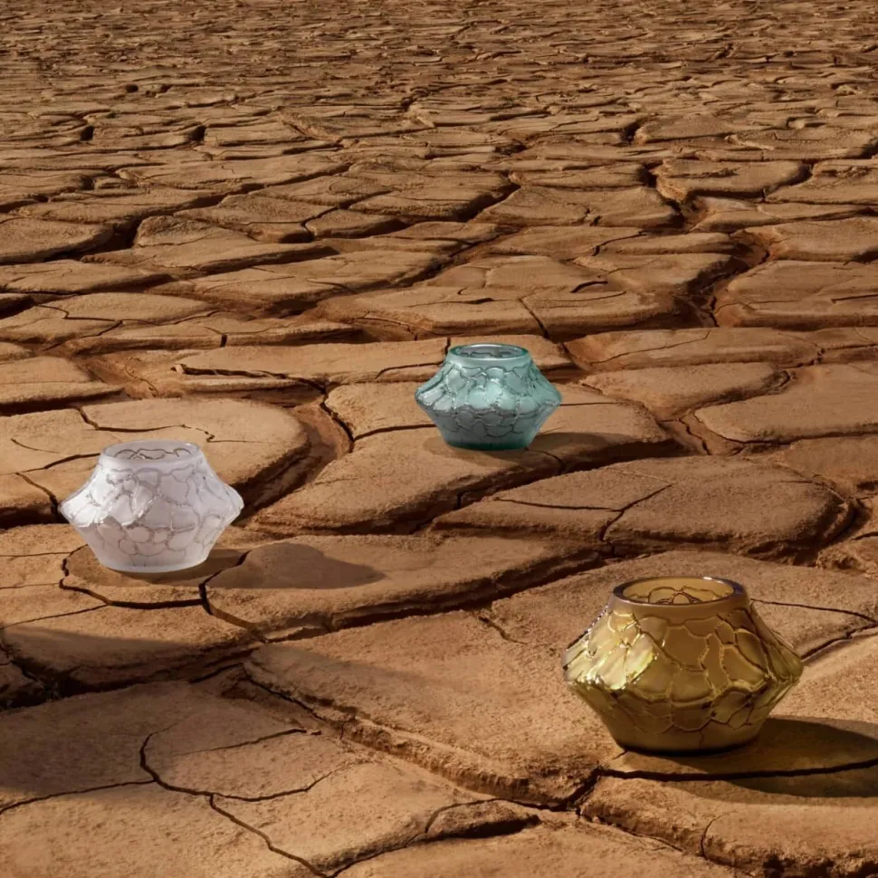 Les pièces Caldera en prennent les contours, sous un délicat motif de craquelures évoquant le perpétuel renouveau de la terre. Entre ombre et lumière, le contraste du décor est sublimé par le cristal satiné repoli, signature de Lalique, qui apporte une esthétique un réalisme singuliers.