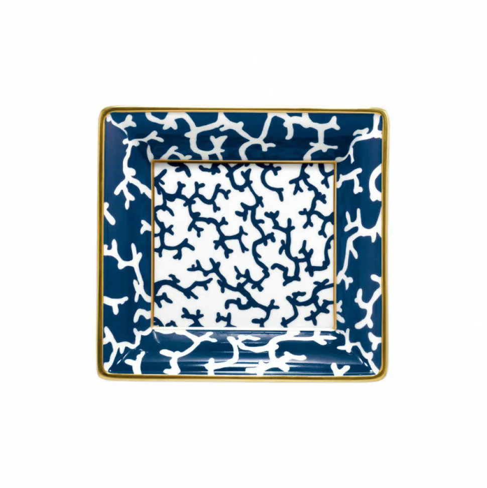 Ce vide-poche carré en porcelaine de Limoges, de 17 cm de côté, séduit par son décor audacieux de coraux blancs sur fond coloré, encadré d’un filet d’or lumineux. Raffiné et pratique, il s’invite avec grâce sur une console, un bureau ou une table de nuit pour accueillir vos petits objets du quotidien avec distinction.